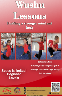 There are many benefits for those who practice Wushu. Physically, Wushu improves muscular strength, endurance and flexibility. It emphasizes superb control of one’s body, utilizing coordination, balance, power and relaxation. Even the most basic stances, punches, and kicks help increase strength and flexibility, while advanced movements and aerial techniques teach speed, coordination, and explosive power. Many students state that Wushu has put them in the best shape of their life, and many people also find Wushu an excellent way to stay fit and lose excess pounds. Students who train in wushu are well-equipped for all other types of sports and martial arts training. At Golden Dragon Chinese Kung-fu we provide instruction based on the individual’s needs; whether you are training for international competition and require the latest in scientific approaches to wushu training, or you are interested in exploring the intense and challenging world of martial arts for the first time. With the incredible depth of wushu culture, there is an aspect of wushu for every student.